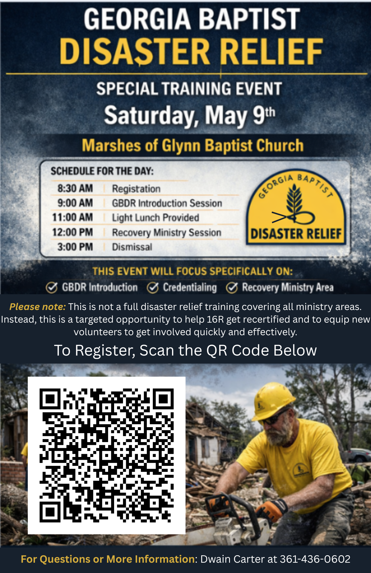Join us for a special Georgia Baptist Disaster Relief training event hosted at Marshes of Glynn Baptist Church on Saturday, May 9. This focused training is designed to help current volunteers receive recertification and to equip new volunteers to get involved quickly and effectively in disaster relief efforts.